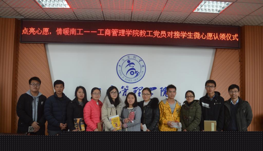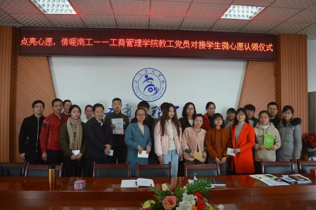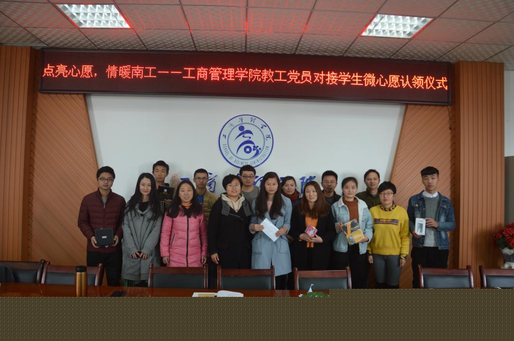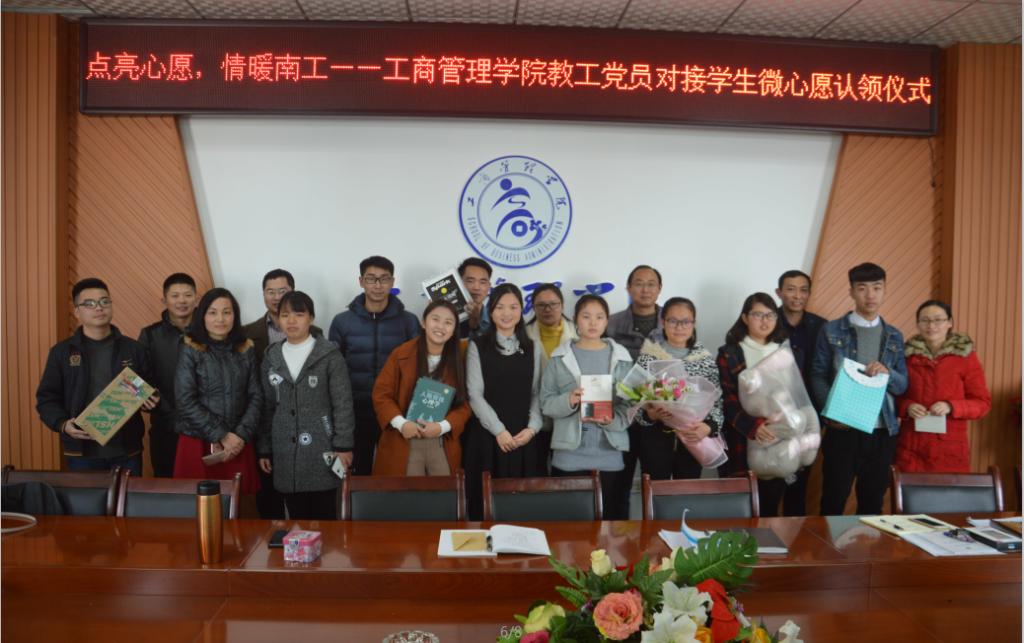 为积极贯彻十九大精神及习近平总书记关于“中国梦”的系列重要讲话精神,引导教工党员亮身份、树形象,践行“四讲四有”标准,充分发挥先锋模范作用,同时让青年学生敢于有梦、勇于追梦、勤于圆梦,12月26日下午,由工商管理学院举办的“点亮心愿,情暖南工— —工商管理学院教工党员对接学生微心愿认领仪式”在北A510室举行。工商管理学院全体教工党员及全体许愿同学80余人参与了活动。
