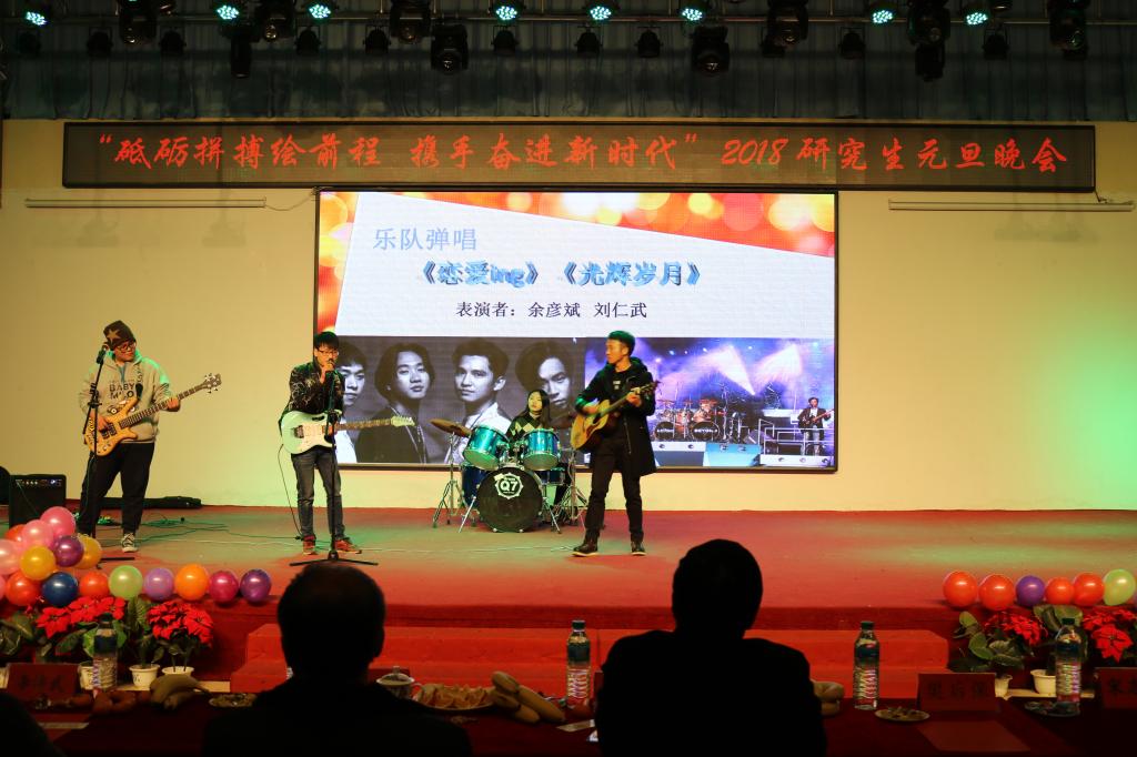 12月26日晚,在大学生活动中心多功能厅,研究生处举办了主题为“砥砺拼搏绘前程,携手奋进新时代”的2018研究生元旦晚会。副校长汪荣有致元旦献词,副校长汪胜前和研究生处处长李沛武、校团委书记宋志刚、水利与生态工程学院院长彭友文、机械与电气工程学院院长黄志开、研究生处党总支副书记陈继宇以及研究生导师代表、研究生处教师等嘉宾出席晚会,全体研究生参加晚会。